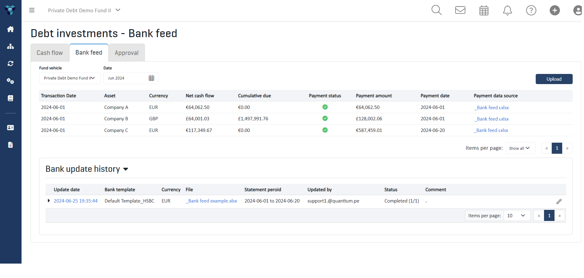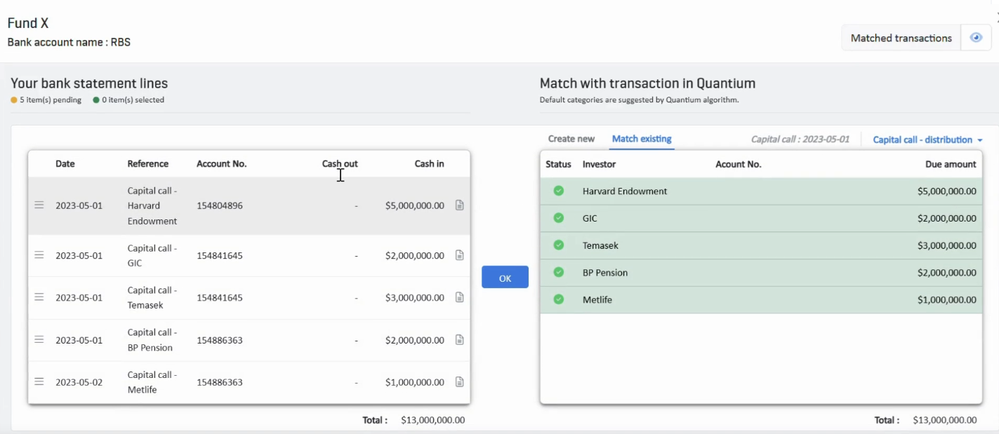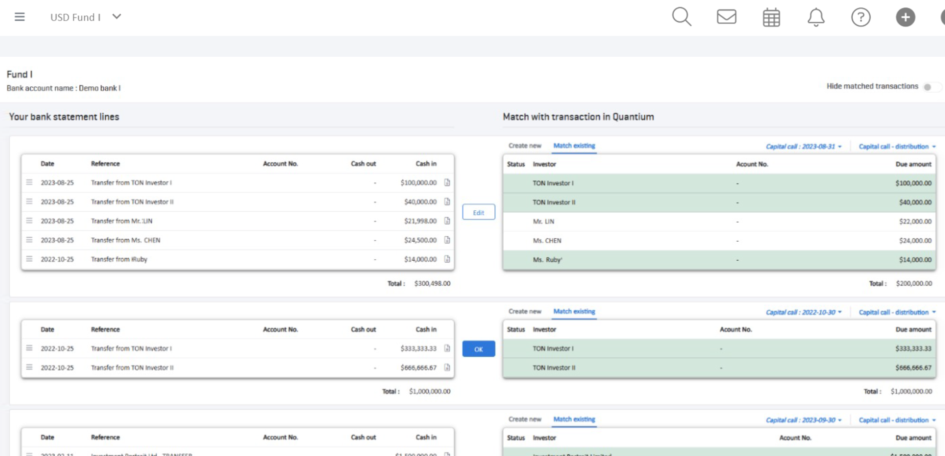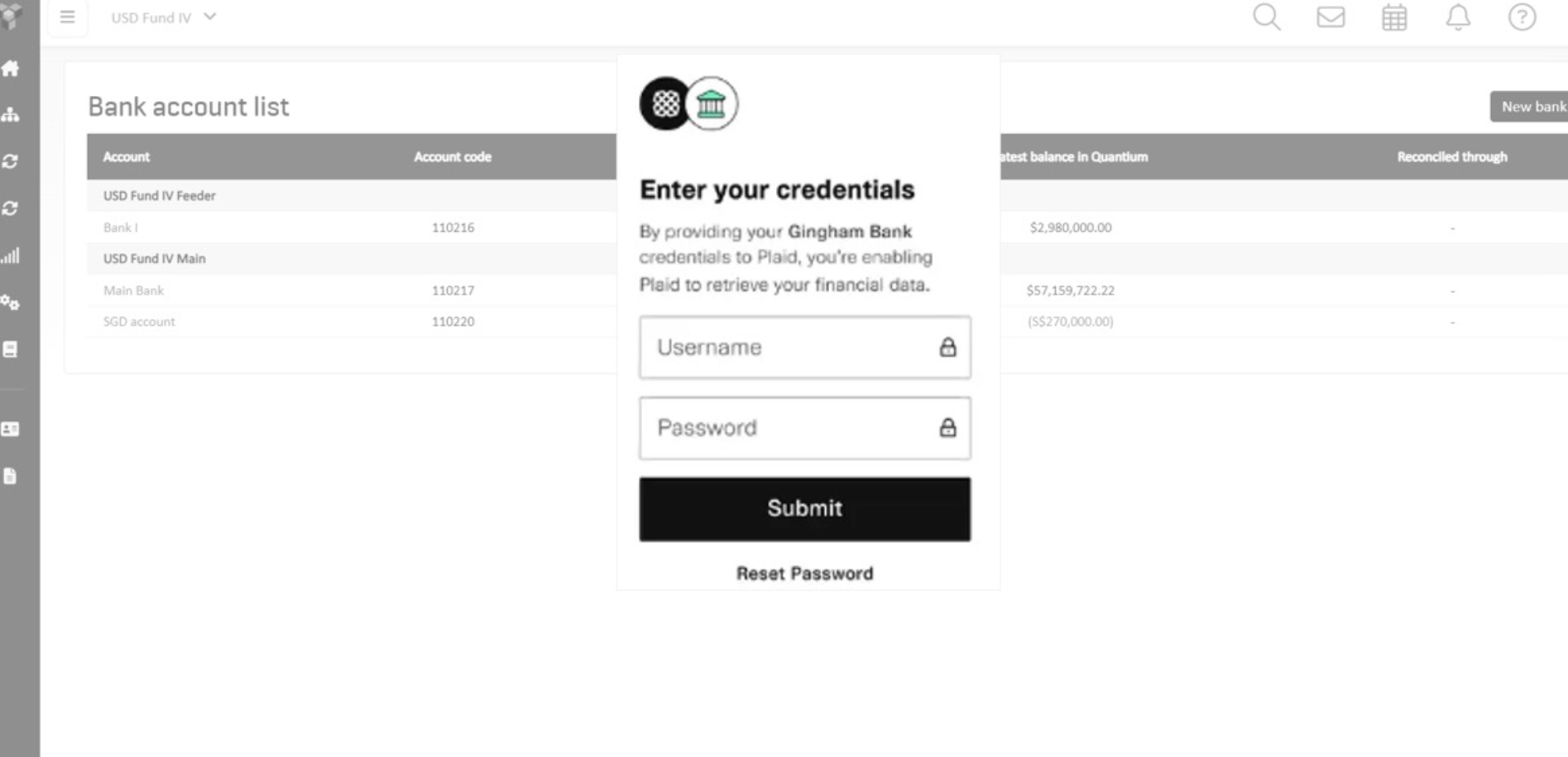 Instantly connect to the most comprehensive network of banking partners worldwide, providing real-time transaction creation, matching and reconciliation. Previously, fund accountants had to manually enter bank transactions one by one. With our new bank feed functionality, you can upload your bank statements or connect your bank feed to Quantium directly, significantly reducing processing time while enhancing transparency and accuracy. Covering thousands of banking partners, this integration enhances operational efficiency for capital call, fund operations, and bank reconciliation workflows.