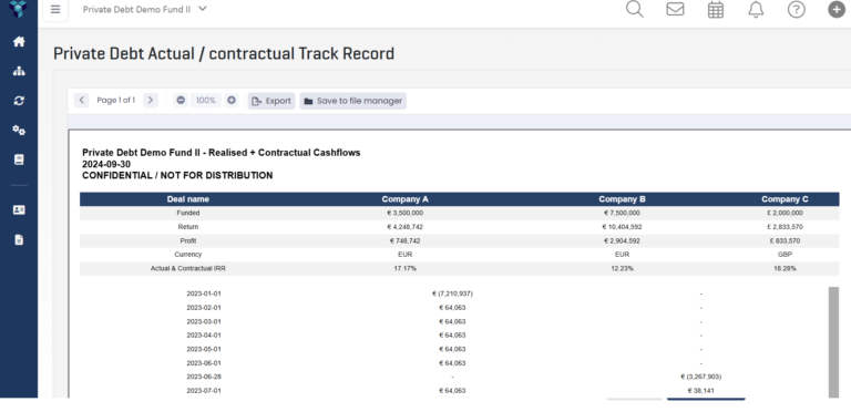 Beyond the standard metrics, it’s important to have contractual and actual vs. contractual performance insights to support holistic reporting. Quantium automates performance tracking across the loan lifecycle, giving fund managers greater accuracy, reduced risk, and easy investor reporting.